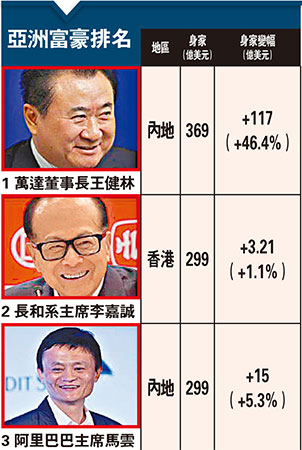彭博富豪榜:王健林李嘉誠馬云包攬亞洲富三甲