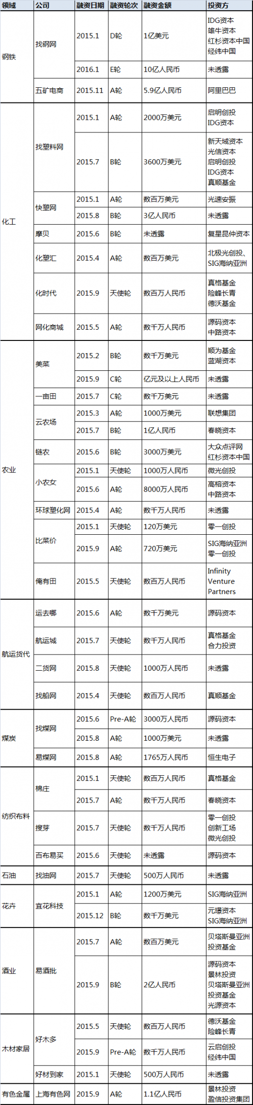 分行業(yè)來看,鋼鐵行業(yè),已出現(xiàn)找鋼網(wǎng)這一融資達(dá)到E輪的獨角獸企業(yè),此外上海鋼聯(lián)已成功登陸創(chuàng)業(yè)板,再加上有著阿里巴巴和五礦集團注資的五礦電商,可以說行業(yè)里已有多個巨頭,已幾乎沒有創(chuàng)業(yè)團隊的空間。