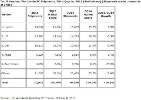 根據(jù)Gartner的數(shù)據(jù),2015年第三季度,聯(lián)想PC銷量略低于1500萬臺——市場份額為20.3%,再次蟬聯(lián)PC市場冠軍,但銷量同比降低4%。銷量同樣降低4%的還有惠普,1370萬臺的銷量使得其獲得了18.5%的市場份額。除蘋果外,戴爾是前六大PC廠商中市場份額唯一增長的廠商,1020萬臺的銷量使得戴爾市場份額增長了0.5個百分點。